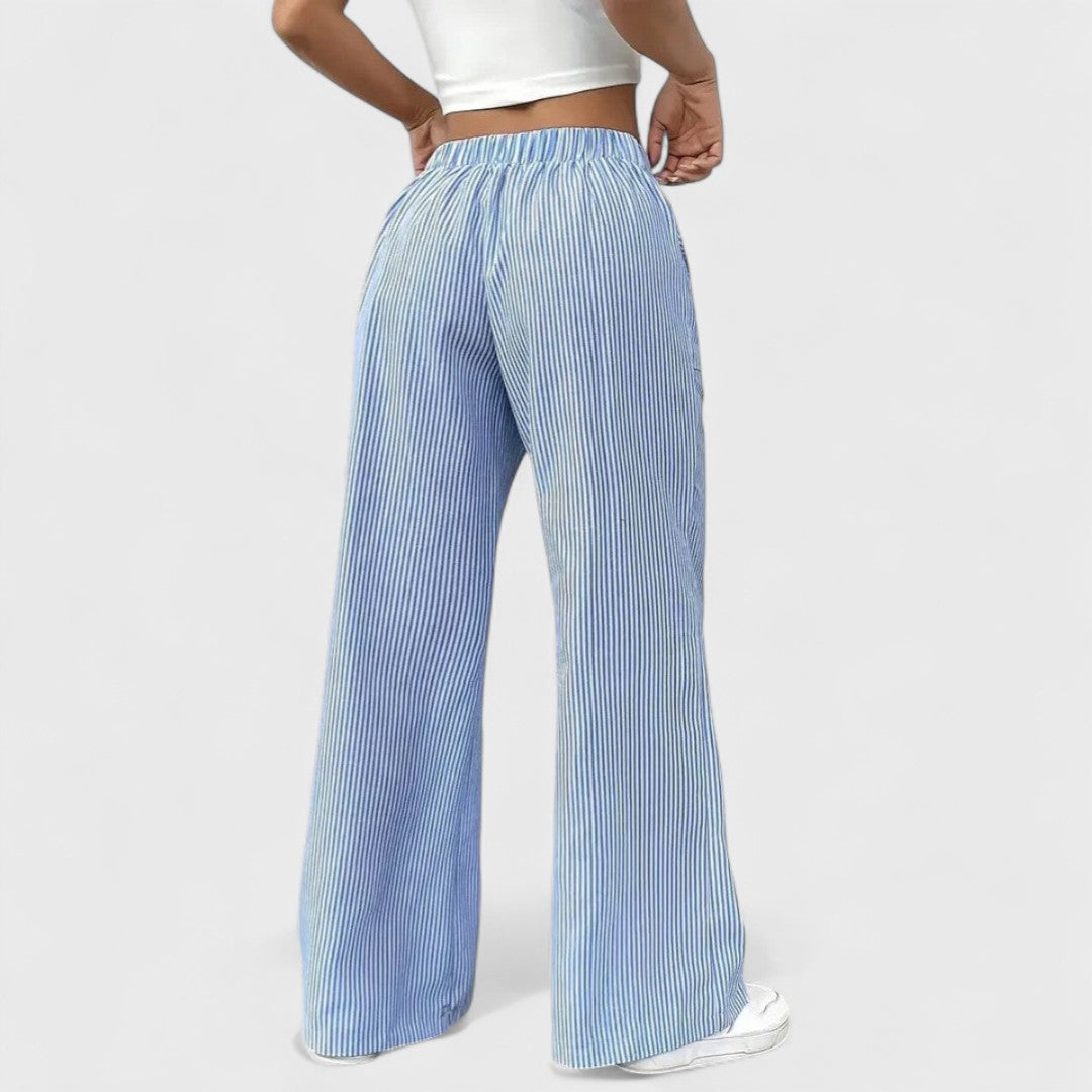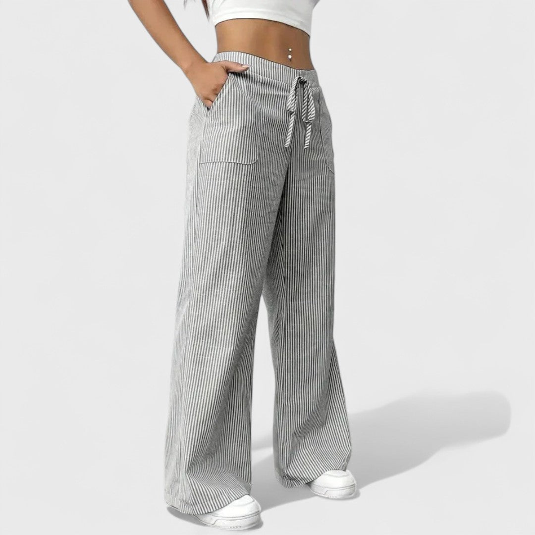 Hlače Dominique so popolna kombinacija sodobnega kroja in brezčasne elegance. Njihove široke, proste nogavice in visok pas z diskretnimi gubami ter pasom ustvarjajo žensko silhueto, ki je ne le stilna, ampak tudi neverjetno udobna. So šivane iz lahkega, zračnega materiala, kar jih dela idealno izbiro za vsako priložnost – od pisarne do večernega druženja.
